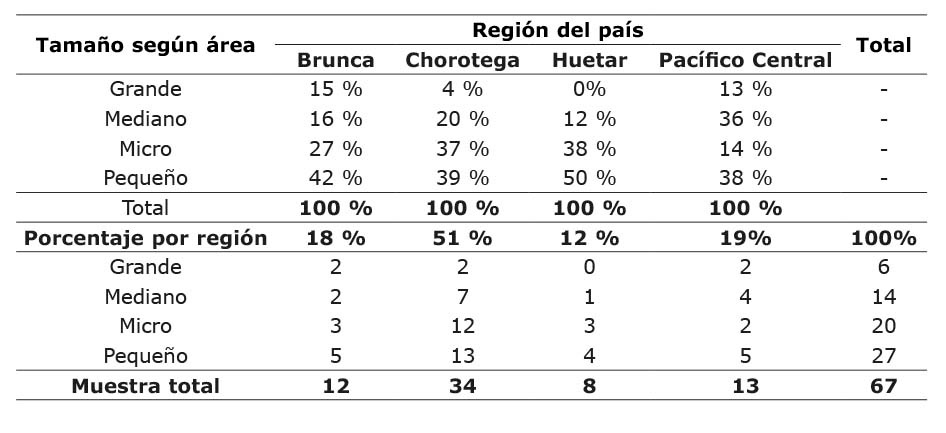 Table 1. Relative distribution of the sample of producers who participated in the study on the adoption of conservation practices in rice cultivation (Oryza sativa L.), according to region and farm size. Costa Rica, 2021.