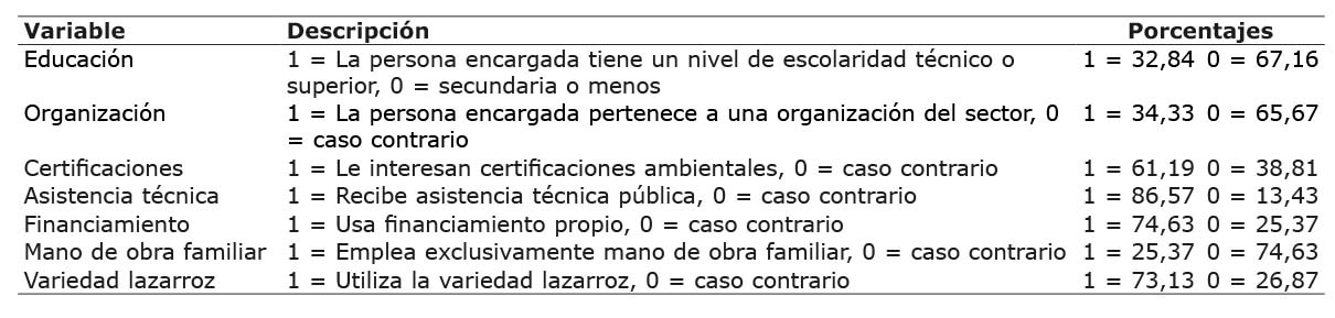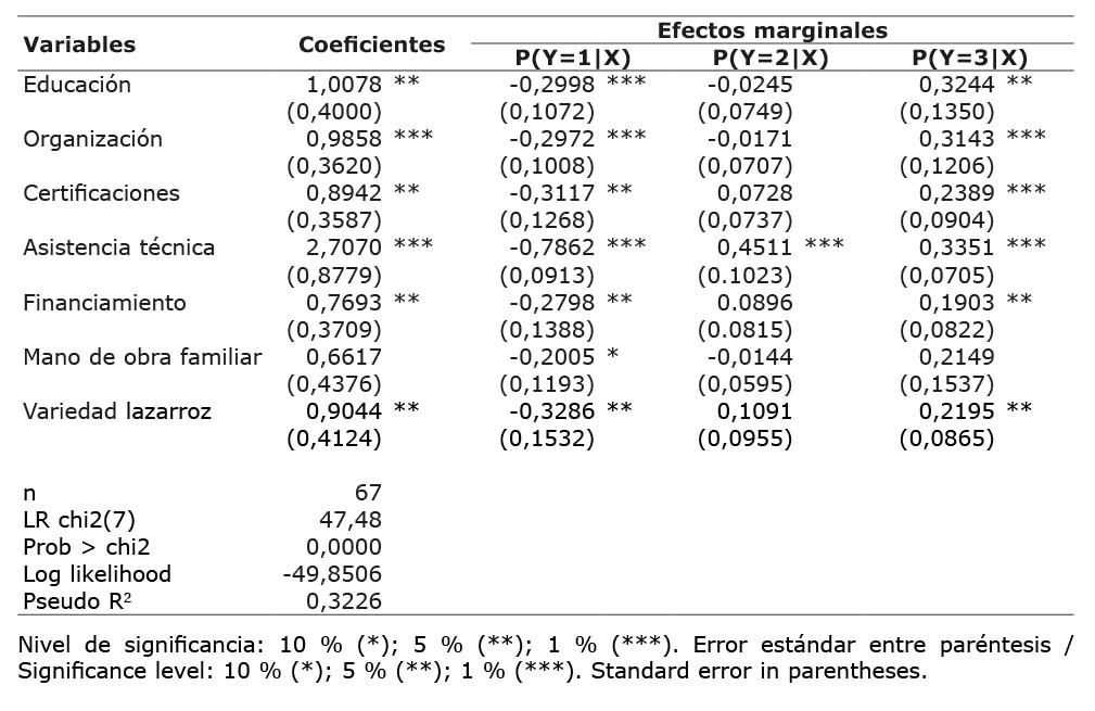 Se empleó un modelo probit ordenado (OP) para analizar los factores que influyeron en la intensidad de adopción de tecnologías vinculadas a una producción sostenible en fincas arroceras. En este modelo el conglomerado o grupo de adopción (1= baja, 2= media, 3= alta), se empleó como la variable ordinal dependiente, y como regresoras se incluyeron: nivel de educación de la persona encargada, afiliación a organizaciones relacionadas a la actividad arrocera, asistencia técnica pública, interés por obtener alguna certificación de tipo ambiental, financiamiento, mano de obra familiar y uso de la variedad Lazarroz FL.