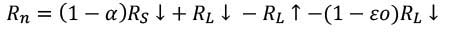 Donde, RS↓ es la radiación de onda corta incidente (W/m2), α es el albedo de la superficie, RL↓ es la radiación de onda larga incidente (W/m2), RL↑ es la radiación de onda larga emitida (W/m2) y ɛo es la emisividad térmica de la superficie, la cual es adimensional.