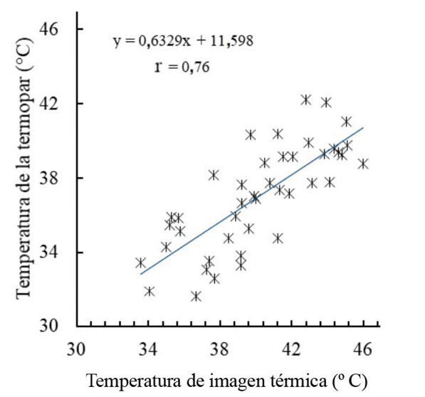 Los valores de la temperatura absoluta de la superficie, proporcionada por las imágenes radiométricas en formato RJPG de la cámara FLIR, se calibraron mediante una correlación lineal con los valores registrados a partir de sensores termopar, en las hojas del cultivo de arroz. Esto se realizó en concordancia con las condiciones ambientales de la zona de estudio. Se obtuvo una ecuación de corrección (Ytermopar = 0,6329 Xcamara-termica + 11,598) con un coeficiente de Pearson de 0,76 (Figura 3).