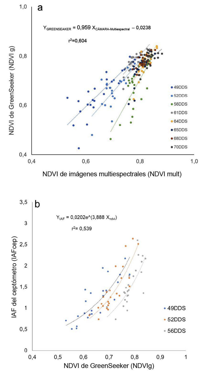Se logró establecer una relación lineal entre el NDVI medido en el campo y el estimado a partir de imágenes multiespectrales. La ecuación de corrección resultante fue YGREENSEEKER = 0,959 XCÁMARA-Multiespectral – 0,0238, y el coeficiente de determinación (R2) alcanzó 0,604 (Figura 4a). Para la estimación espacial del IAF, se realizó una correlación con el NDVI. Los datos recolectados en campo (IAF, NDVI) generaron una correlación exponencial con la ecuación YIAF = 0,0202e^(3,888 Xndvi), que presentó un coeficiente de determinación (R2) de 0,539 y un error cuadrado medio (RMSE) de 0,35 (Figura 4b). Estos valores son específicos para las condiciones climáticas locales y el dosel del cultivo, observados durante el período entre macollamiento y punto de algodón.