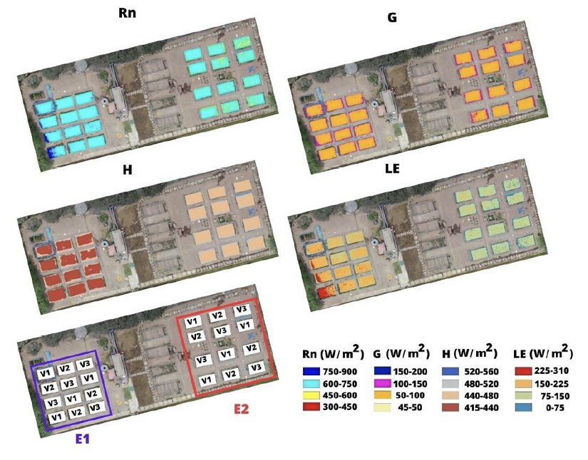 Figure 5. Spatial distribution of net radiation (Rn), soil heat flux (G), sensible heat flux (H), and latent heat flux ((LE) during the tillering stage of the rice (Oryza sativa) (70 DAS), in the Experimental Irrigation Area (AER) of the Universidad Nacional Agraria La Molina, Lima Peru, 2019.