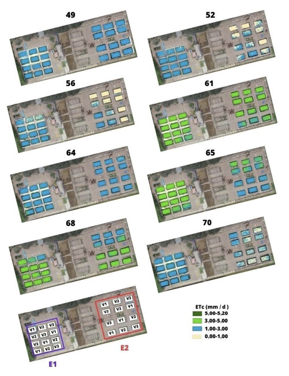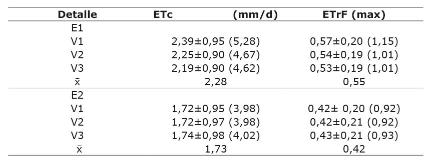 La variación espacial y temporal de la ETc con valores ( ± S) de 2,39 ± 1,01 (V1), 2,25 ± 0,97 (V2), 2,19 ± 1,01 (V3) en E1 y 1,72 ± 1,03 (V1), 1,72 ± 1,05 (V2), 1,74 ± 1,05 (V3) en E2 (Figura 6). Además, se observó que en el riego con secas controladas (reducción hasta 65 % de humedad del suelo saturado) hubo una reducción del 28, 24 y 21 %, según variedades de arroz IR43, IR71706 y Sahod Ulan 12, respectivamente (Cuadro 3).