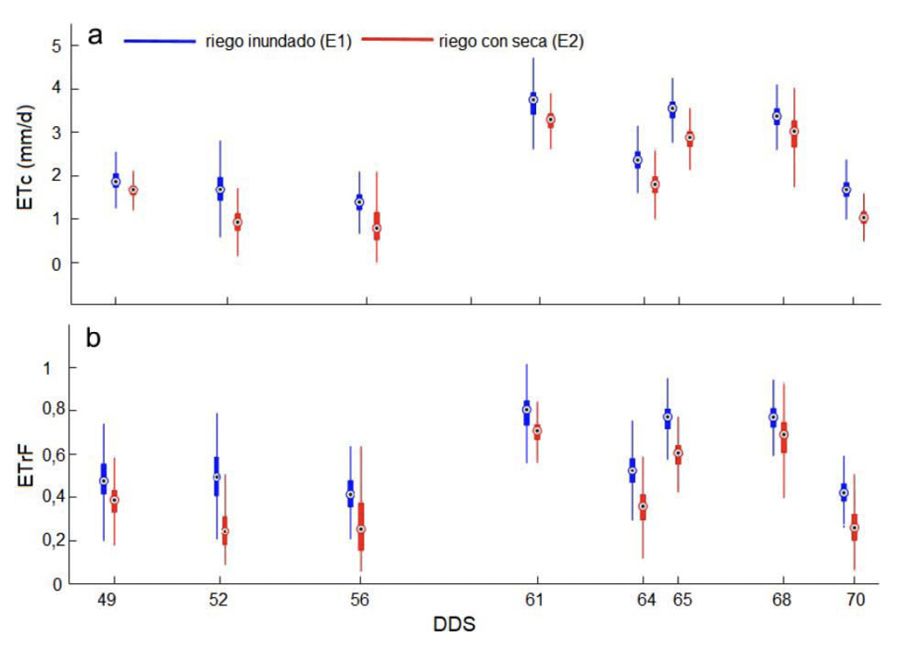 La variación temporal de la ETc durante los estadios de macollamiento hasta punto de algodón se observa en la Figura 6a. En este periodo se realizó las secas controladas hasta el 65 % de humedad del suelo saturado (49 a 70 DDS). En el riego inundado (E1) se obtuvo valores mayores de la ETc. Al igual que la fracción de evapotranspiración (ETrF) (Figura 7b), cuyos valores variaron entre 0,2 y 0,8 durante todo el monitoreo.