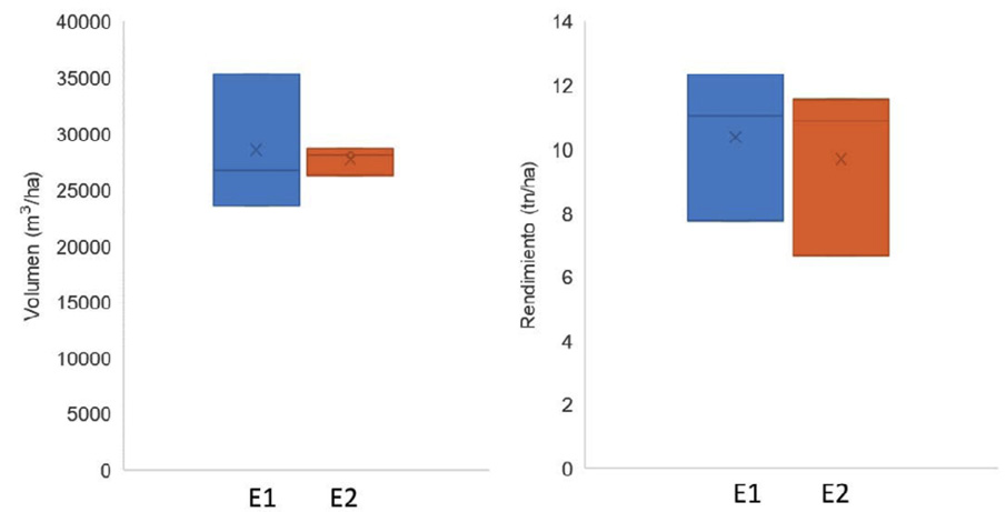 El análisis combinado de experimentos, junto con el análisis de varianza y la prueba de Duncan con p<0,05, reveló una diferencia significativa entre el riego inundado (E1) y el riego con secas controladas (E2). Sin embargo, no se encontró diferencia significancia entre las variedades de arroz (tratamientos). La relación ETc/ETo conocido como ETrF, presentó valores ( ± S) (máximo) de 0,55±0,21 (1,15) en E1 y de 0,42±0,19 (0,93) en E2. Además, presentó una reducción del 26 %, 12 % y 19 % para IR43, IR71706 y Sahod Ulan 12, respectivamente. Para el volumen consumido y el rendimiento de cada experimento (Figura 8), se observó una diferencia de volumen consumido entre tratamientos.