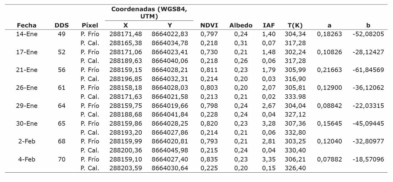 Los valores de las variables NDVI, IAF, albedo y temperatura superficial que fueron seleccionadas para realizar el ajuste del píxel frío y caliente, se aprecia en el Cuadro 1. Estos valores se obtuvieron a través de las constantes a y b en todas las fechas de vuelo. Valores que permiten la estimación del flujo del calor sensible del aire (H), y su variación respecto al píxel frío o píxel caliente en cada día de monitoreo. Se obtuvieron valores de NDVI cercanos a uno para el píxel frío, y cercanos a cero para el píxel caliente. Además, se puede notar que los valores del NDVI, al igual que el IAF, en su mayoría tienden a aumentar a medida que pasa el tiempo desde el día después de la siembra (DDS). Sin embargo, hubo algunas fechas en las que se observó una reducción en el IAF, como en el caso del 68DDS, y también una reducción en el NDVI en el 52DDS. Estas variaciones solo se presentaron en el píxel frío.