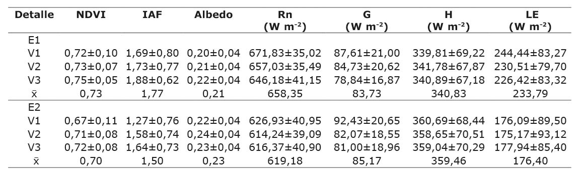 El promedio y la desviación estándar para NDVI, IAF Albedo, Rn, G, H y LE, por variedades y tratamiento, se muestra en el Cuadro 2. En el caso de las parcelas con riego y secas controladas (E2), una reducción del 4, 15, 6 y 25 % para NDVI, IAF, Rn y LE, y un incremento del 10, 2 y 5 % para Albedo, G y H. No hubo diferencia significativa entre variedades según análisis de varianza y la separación de medias de Duncan con p<0,05.
