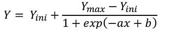 Donde Y es la biomasa de la planta; Ymax es la biomasa máxima acumulada por la planta; Yini: es la biomasa inicial acumulada por la planta; x es el tiempo en DDS; a es la tasa de crecimiento (o absorción); y b es el punto medio de la curva sigmoide (x = b/a) son coeficientes constantes.