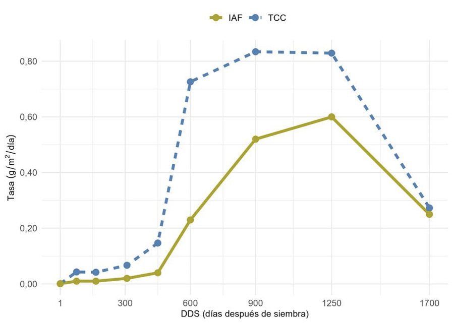 El mayor desarrollo de las plantas de pitahaya se encontró entre los 600 y 1250 días después de la siembra (DDS) (Figura 1). El índice de área foliar (IAF) mostró un incremento de 0,20 a los 450 DDS hasta los 1250 DDS con un 0,60, luego presentó un decrecimiento del IAF. Este comportamiento se encontró al analizar la tasa de crecimiento de cultivo (TCC), al mostrar el mismo comportamiento a los 450 DDS con 0,10 g/m2/día y 0,70 g/m2/día a los 1250 DDS.