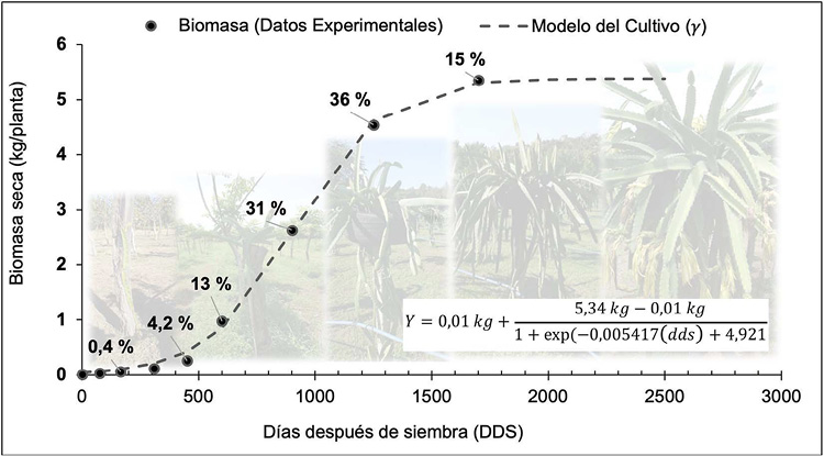 El mayor incremento en la biomasa seca en el cultivo de pitahaya se encontró entre los 900 y 1250 DDS, con un 31 % y 36 % de total acumulado, respectivamente (Figura 2). El incremento al inicio (0-500 DDS) y al final (1500-2000 DDS), fueron inferiores al 15 %.