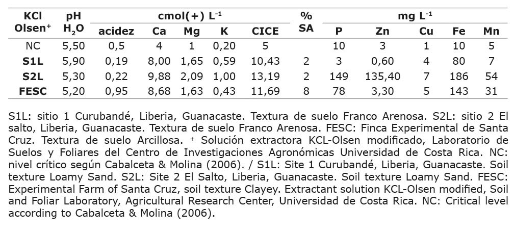 El suelo donde se ubicaron las unidades de manejo agronómicas utilizadas para el análisis de crecimiento de pitahaya mostraron suficiencia nutricional, según el nivel crítico desarrollado para la solución extractora KCl-Olsen modificado (Cuadro 1). Según las caracterizaciones previas de los sitios, se determinó que la concentración de bases se encontró en suficiencia, los suelos de Liberia (S1L, S2L) no mostraron problemas de acidez intercambiable (Cuadro 1), mientras que los suelos de Finca Experimental de Santa Cruz (FESC) de la Universidad de Costa Rica mostraron acidez causada por fertilización nitrogenada. Los suelos de Liberia manifestaron deficiencias de P y Zn. La textura encontrada en estos suelos fue: franco arenoso para la zona de Liberia y arcillosa para los suelos de Santa Cruz. Las plantas no mostraron déficit hídrico durante la época seca, debido a que las unidades agronómicas contaron con irrigación.