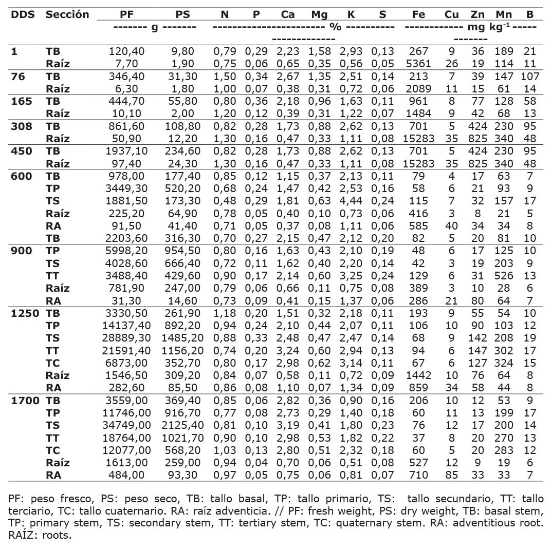 Cada planta seleccionada fue separada en muestras categorizadas por tallo basal (TB), tallo primario (TP), tallos secundarios (TS), tallos terciarios (TT), tallo cuaternario (TC) y raíces (RA). Las raíces a su vez fueron separadas en raíces primarias y adventicias. Cada muestra fue procesada en la Finca Experimental de Santa Cruz, para obtener el peso fresco y seco de las partes. Luego fueron enviadas al Laboratorio de Suelos y Foliares del Centro de Investigaciones Agronómicas de la Universidad de Costa Rica, donde se cuantificó la concentración (%) de N, P, Ca, Mg, K, S, Fe, Cu, Zn, Mn y B, también se determinó la totalidad de materia seca para el desarrollo del análisis de crecimiento de las plantas y la calibración del modelo de crecimiento de cultivo.