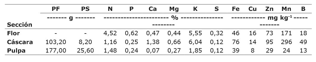 Las concentraciones de los nutrimentos en las diferentes partes de la planta podrían variar según la fórmula o fertilización usada en cada unidad de manejo. Esto se demostró al ver las variaciones entre el Zn y B (Cuadro 3). La flor es una estructura que tiene alta concentración de N, K y B, esto puede indicar que incrementar estos nutrimentos en el fraccionamiento en meses próximos a la floración (febrero - abril) podría aumentar la floración del cultivo y por tanto, en polinización - fructificación del cultivo (Campos Granados, 2022). En otros cultivos perennes se ha demostrado que conforme crece el fruto las concentraciones de los nutrimentos varían en el tiempo (Paramasivam et al., 2000; Silber et al., 2018; Wang et al., 2008). Por lo tanto, se debe enfatizar en la utilización correcta de nutrientes específicos según la demanda anual de cada nutriente o el estado fenológico de las plantas.