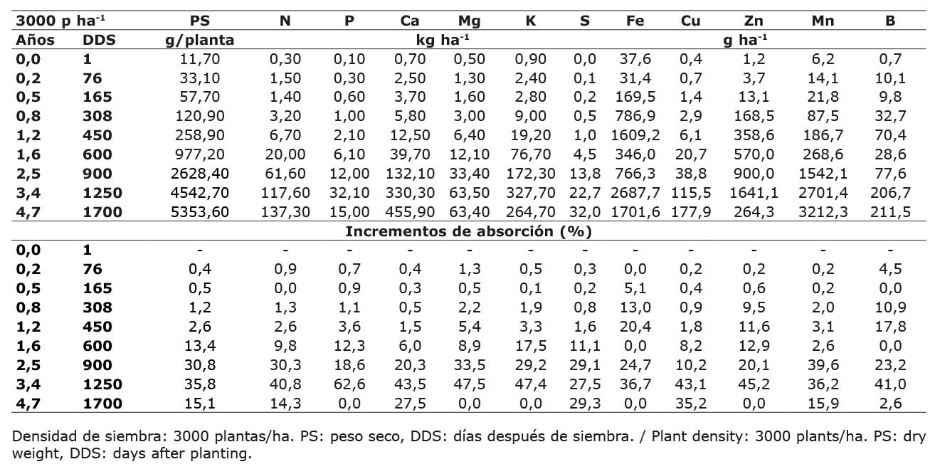 La absorción máxima alcanzada por las plantas de pitahaya se encontró entre los 1270 y 1700 DDS (Cuadro 4). La absorción calculada para 3000 plantas/ha de N, P, K, Mg, Ca y S fue de 137, 30, 32,10, 327,70, 63,50, 455,90, 32,00 kg ha-1 y 1641,10, 2165 g ha-1 para Zn y B, respectivamente. Los incrementos máximos de absorción alcanzada para cada nutrimento (10,20 % – 62,60 %) se encontraron entre los 900 y 1250 DDS (2,5 y 3,4 años). También se encontró que el orden de absorción de nutrimentos fue Ca > K > N > P > S > Fe > Zn > B > Mn > Cu.