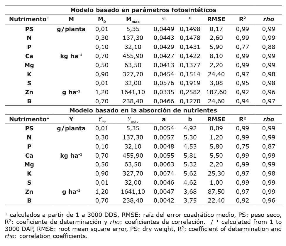Los parámetros estimados, el RMSE, el R2 y el coeficiente de correlación (rho) entre los valores observados y los valores predichos para cada modelo se presentan en el Cuadro 5. Al comparar el RMSE y el R2, se observó que el modelo basado en parámetros fotosintéticos tenía un RMSE mayor para los nutrientes N, P, Ca, S, Zn y B en comparación con el modelo basado en la absorción de nutrientes. Sin embargo, el R2 de ambos modelos fue superior al 92 %, con la excepción de P, que mostró un R2 del 75 % y 77 % para los modelos correspondientes. En general, el modelo basado en la absorción de nutrientes mostró el mejor ajuste, por lo que los resultados presentados en la Figura 2 corresponden a las estimaciones obtenidas mediante este modelo.