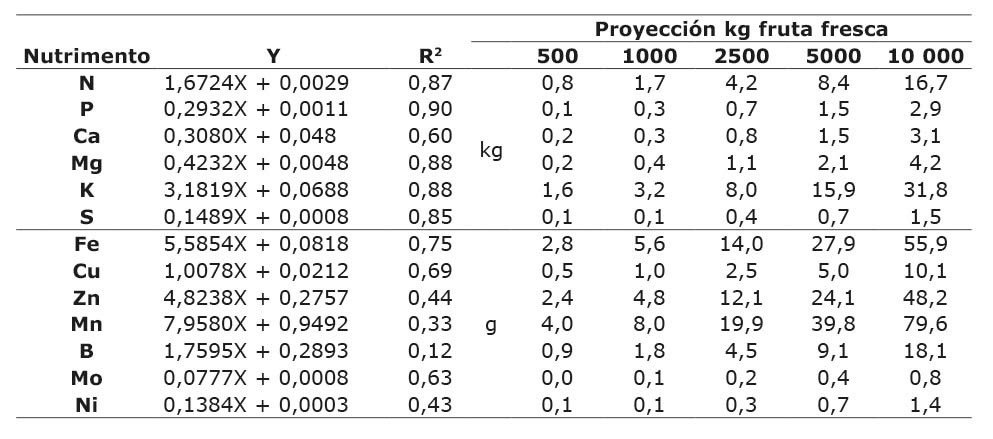 El modelo de regresión lineal fue significativo para modelar la relación funcional entre la absorción de nutrimentos y el tamaño de frutos (Cuadro 6). El modelo de predicción obtuvo un R2 de 0,85 para los macronutrientes en frutas, a excepción de Ca que mostró un R2 de 0,60. En el caso de los micronutrientes el ajuste fue inferior al 75 %. La proyección de fruta computado de las ecuaciones lineales (a partir de 500 kg hasta 10 000 kg de fruta fresca) predice (R2 = 0,85) los requerimientos nutricionales de N, P, K, Mg y S, para una producción potencial de los sitios de productores de la pitahaya en Costa Rica.