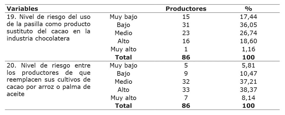 En lo que respecta al nivel de riesgo existente sobre el uso de pasilla como producto sustituto del grano de cacao, el 53,49 % de los participantes consideró que es bajo a muy bajo, un 26,74 % indicó un grado de tipo medio, y un 19,76 % manifestó que existe un nivel de riesgo alto a muy alto. El 46,51 % de los encuestados consideraron que es alto a muy alto el riesgo relacionado con reemplazar los cultivos de cacao por otros de mayor rentabilidad existentes en la zona, y un 37,21 % expresaron un nivel medio, mientras que un 16,28 % señalaron que existe un nivel bajo a muy bajo (Cuadro 9).