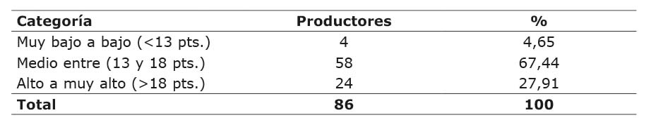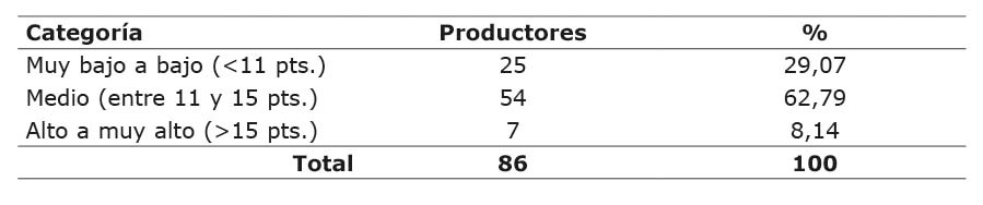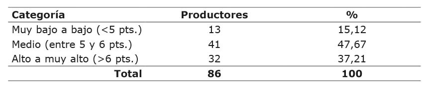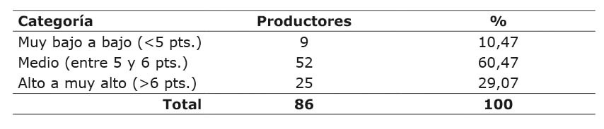 En cuanto al análisis categórico de la variable rivalidad entre productores este mostró, que el 62,79 % de los productores se encuentran en la categoría medio, el 29,07 % en muy bajo a bajo y 8,14 % entre alto a muy alto. (Cuadro 6).