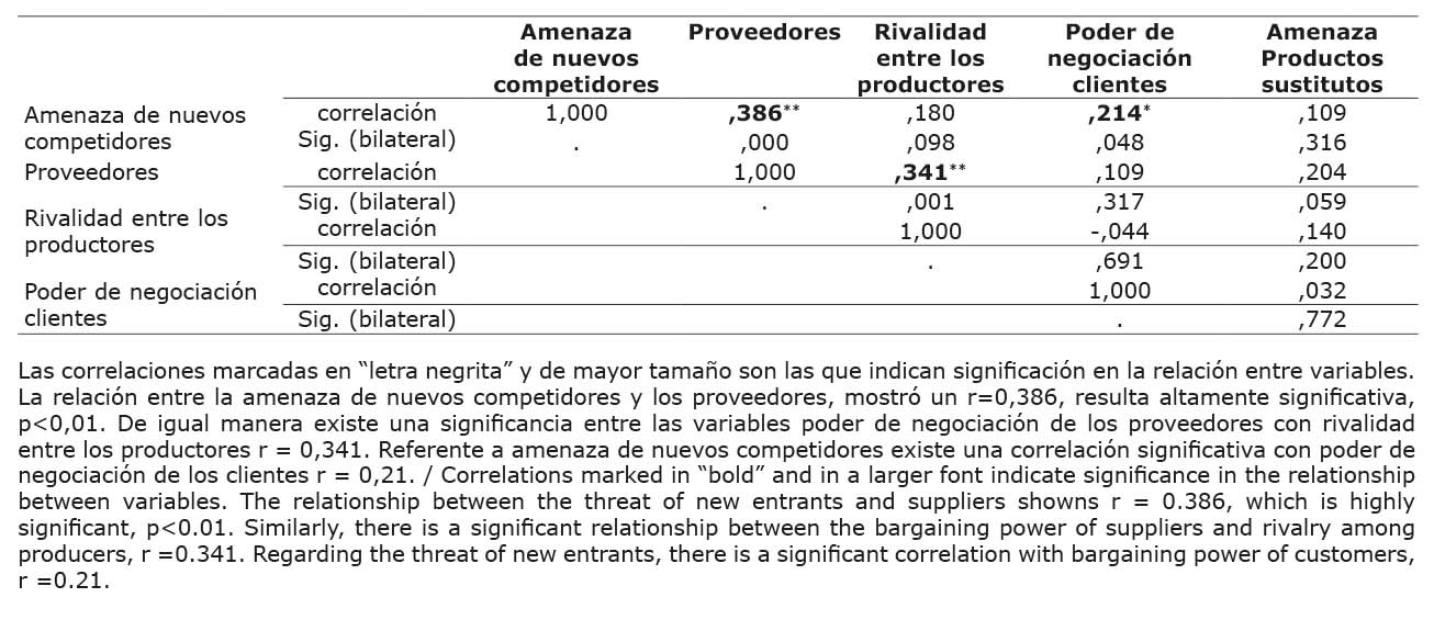 En cuanto al coeficiente de correlación de Spearman para las variables evaluadas, se encontraron mayores vínculos entre la amenaza de nuevos competidores con las relacionadas con poder de negociación de proveedores y rivalidad entre los productores, y se logró identificar correlaciones significativas entre las variables poder de negoción de los proveedores con la rivalidad existente entre los productores (Cuadro 11).