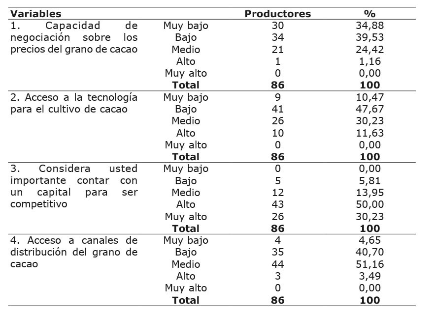 En lo que concierne a la importancia de contar con un capital para ser competitivo, el 80,23 % de los productores determinó que es alto a muy alto, un 13,95 % estimó un nivel medio, mientras que tan solo un 5,81 % indicó una baja importancia. Referente al acceso que tienen los cacaocultores a canales de distribución del grano producido en sus fincas, el 45,35 % calificó que es bajo a muy bajo, un 51,16 % expresó un nivel de tipo medio y tan solo un 3,49 % de los encuestados consideró que el acceso es alto (Cuadro 1).