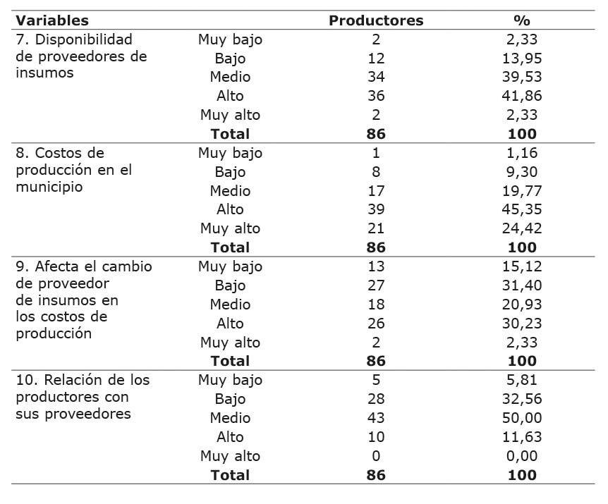 Referente a la disponibilidad de proveedores de insumos en el municipio, el 16,28 % indicó que es bajo a muy bajo, un 39,53 % medio y por último, un 44,19 % consideró que es alto a muy alto. Para la variable costos de producción, un alto porcentaje de los encuestados respondieron que son altos a muy altos (69,77 %), seguido por el nivel medio con un 19,77 % y tan solo un 10,46 % señaló que son bajos a muy bajos (Cuadro 3).