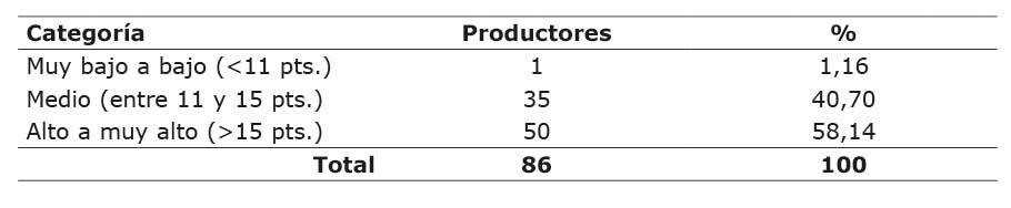 Respecto al análisis categórico de la variable poder de negociación de los clientes, el 60,47 % de los productores encuestados se encuentran en la categoría media, un 29,07 % entre alto a muy alto, y solo el 10,47 % exhiben niveles de bajo a muy bajo (Cuadro 8).
