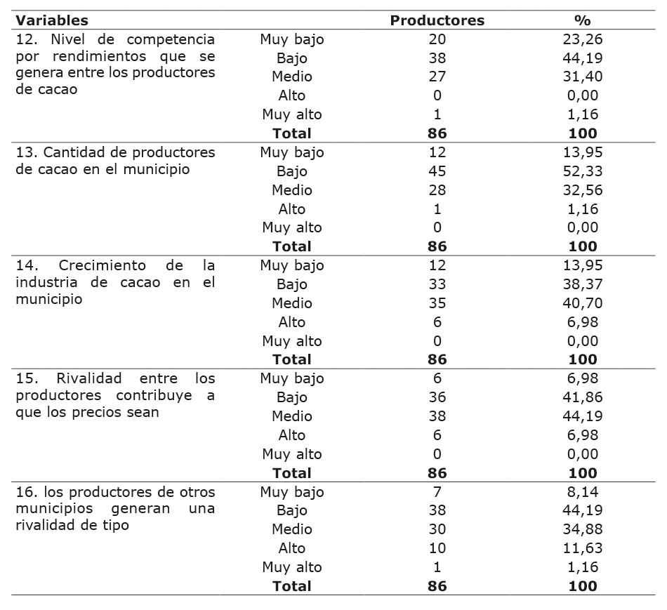 En lo que concierne al nivel de rivalidad existente entre los cacaocultores, los resultados indicaron que fue baja o muy baja, para el caso de San José de Cúcuta, la actividad cacaotera es representada como una alternativa de menor importancia sobre otros cultivos también instalados en la región, por tanto, no se genera una competencia interna por factores como rendimientos y calidad por parte de los cultivadores en sus predios.
