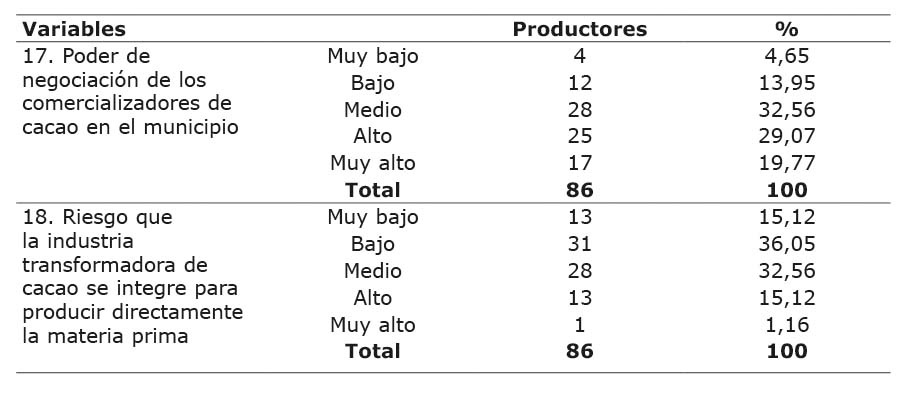 En lo que refiere al poder de negociación que ejercen los comercializadores de cacao en el municipio, el 48,84 % de los productores consideraron que es alto a muy alto, un 32,56 % señalaron un nivel medio, mientras que tan solo un 18,6 % expresaron que el poder que efectúan en la zona es bajo a muy bajo. En cuanto al nivel de riesgo existente relacionado con la producción directa del grano por parte de la industria cacaotera, el 51,17 % de los encuestados estimó que es bajo a muy bajo, un 32,56 % expresó un grado de tipo medio, mientras que un 16,28 % señaló niveles de riesgo altos a muy altos para esta variable (Cuadro 7).