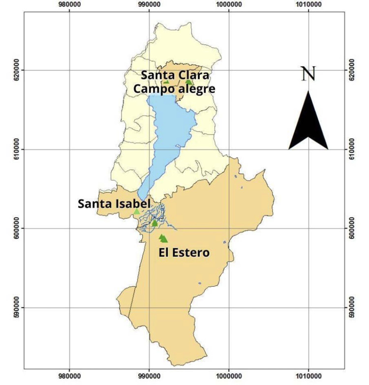 Figure 1. Distribution of the mortiño (Vaccinium floribundum Kunth) in the Azonal Páramos of Pasto, Colombia. The green triangles indicate that shrubs of this species are located in the villages of Santa Clara, Campo Alegre, Santa Isabel, and El Campanero. The blue colored area represents the “Laguna de la Cocha”. El Encano, 2021.