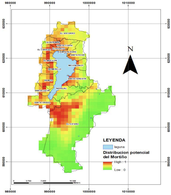 Figure 2. Potential mortiño (Vaccinium floribundum Kunth) distribution in the Azonal Páramos of El Encano, Pasto, Colombia, 2021.