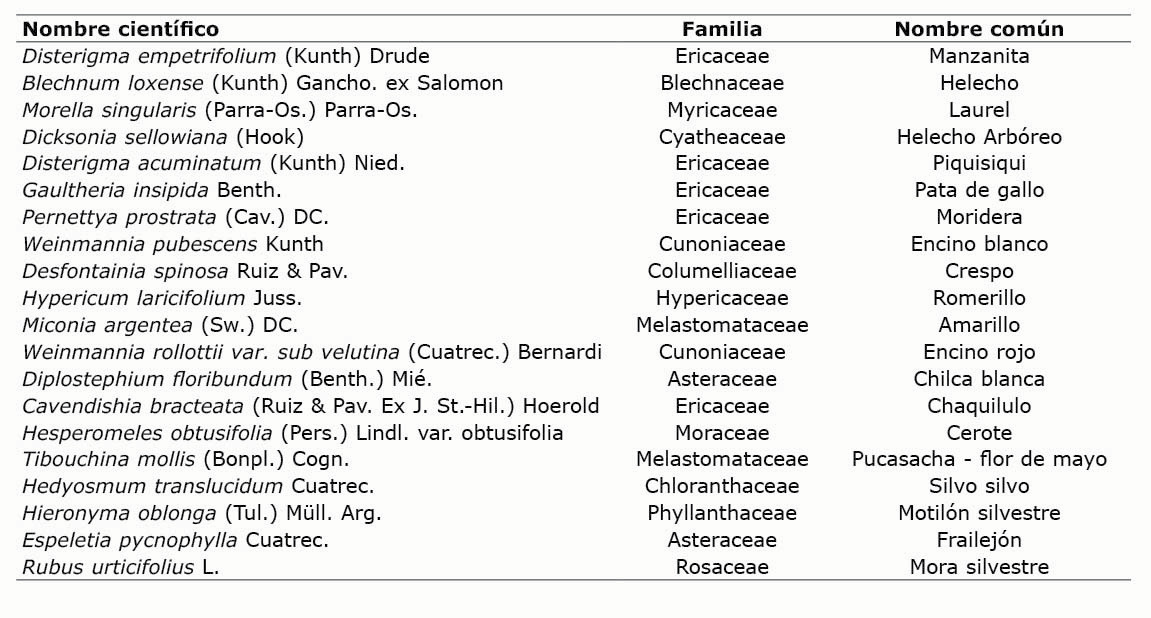 Table 1. Species, family, and common name of plants associated with mortiño (Vaccinium floribundum) in El Encano, Pasto, Colombia. 2021.