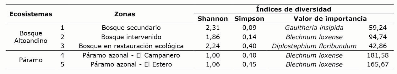 Table 2. Biological indices, Shannon, Simpson, and importance value of species associated with mortiño (Vaccinium floribundum) in two ecosystems and five zones in El Encano, Pasto, Colombia. 2021.