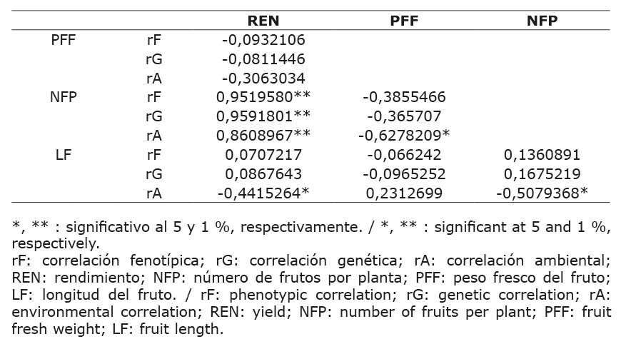 Los coeficientes de correlación fenotípicas (rF) y genotípicas (rG) entre las variables revelan una correlación positiva y altamente significativa entre el rendimiento (REN) y el número de frutos por planta (NFP), mientras que para las variables peso fresco del fruto (PFF) y largo del fruto (LF) no se detectaron correlaciones significativas con el rendimiento para la rF y rG (Cuadro 9). Los coeficientes de correlación ambiental (rA) entre el par de variables REN con LF, NFP con PFF y LF con NFP mostraron una correlación negativa y significativa. Para estos tres casos, los valores de rA resultaron ser mayores a los valores de rF y rG, lo que implica la existencia de efectos ambientales y/o factores no aditivos sobre el nivel real de expresión de la correlación en tales caracteres.