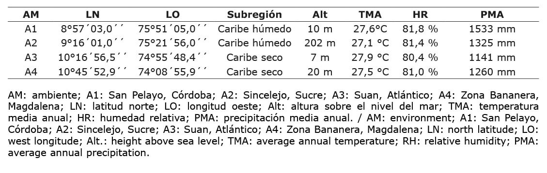 La investigación se realizó durante el periodo marzo-octubre del 2020 en cuatro localidades de la región Caribe de Colombia, todas correspondientes a la zona de vida bosque seco tropical, según la clasificación de Holdridge (Holdridge, 1967). Las evaluaciones se realizaron en tres lotes comerciales de agricultores en los departamentos de Atlántico, Córdoba y Sucre, así como en una localidad establecida en el Centro de Investigación Caribia de AGROSAVIA, ubicada en el municipio de Zona Bananera, Magdalena (Cuadro 1).
