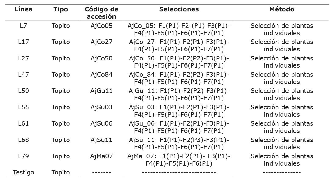 Se evaluaron un total de nueve líneas avanzadas F7 de ají dulce tipo topito (Capsicum chinense Jacq., sinense Murray), obtenidas mediante el método de selección de plantas individuales con prueba de progenie por el Programa de Mejoramiento Genético de Hortalizas de AGROSAVIA, Centro de Investigación Caribia, más un testigo regional que corresponde al cultivar nativo usado por los agricultores. Este no ha pasado por ningún proceso de fitomejoramiento sistemático y controlado, y su semilla es producida por los mismos agricultores (Cuadro 2).
