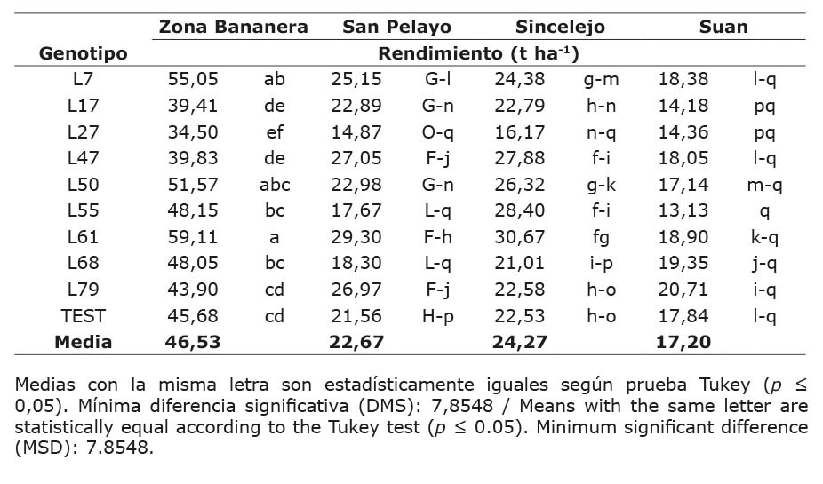 El rendimiento mostró una amplia variación; se obtuvieron valores entre 59,11 t ha-1 para L61 en Zona Bananera hasta 13,13 t ha-1 para L55 en Suan. El mejor ambiente fue Zona Bananera con una media general de 46,53 t ha-1. Sincelejo y San Pelayo tuvieron medias generales similares de 24,27 y 22,67 t ha-1, respectivamente; mientras que Suan fue el ambiente de menor potencial productivo con una media general de 17,60 t ha-1. La línea L61 obtuvo el primer lugar en rendimiento en las localidades de Zona Bananera, San Pelayo y Sincelejo, mientras que en la localidad de Suan obtuvo la tercera posición. Las líneas L7 y L50 mostraron los mayores rendimientos en el ambiente Zona Bananera con 55,05 y 51,57 t ha-1, respectivamente. El testigo presentó valores intermedios dentro del grupo evaluado, sin llegar a estar entre los mejores cinco valores en ninguna de las localidades (Cuadro 3).