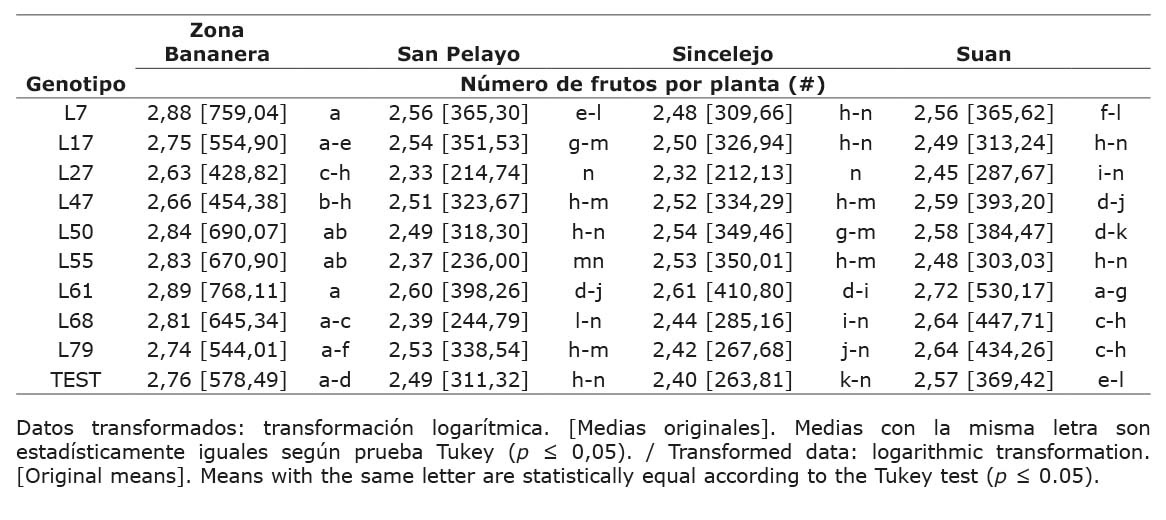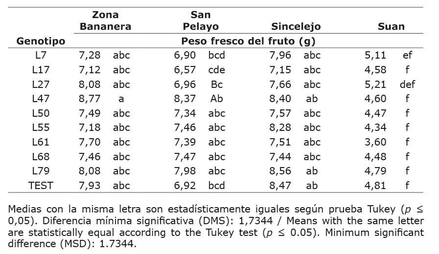 Al igual que para el rendimiento, la localidad de Zona Bananera fue el mejor ambiente para el número de frutos por planta, con una media general de 609 frutos por planta, lo cual está cerca de duplicar las medias generales de los ambientes Sincelejo y San Pelayo, que tuvieron medias generales similares entre sí, con 311 y 310 frutos por planta, respectivamente. Por su parte, Suan fue el segundo mejor ambiente con una media general de 383 frutos por planta. Las mejores interacciones fueron de las líneas L61, L7 y L50 en el ambiente Zona Bananera con 768, 759 y 690 frutos por planta, respectivamente (Cuadro 4). El peso fresco del fruto (PFF) presentó medias generales en los ambientes de Sincelejo, Zona Bananera y San Pelayo de 7,90, 7,71 y 7,33 g, respectivamente; mientras que Suan registró una media general de 4,60 g. Para el PFF, las mejores interacciones correspondieron a los genotipos L47 en Zona Bananera (8,77 g); L79 (8,56 g) y TEST (8,47 g) en Sincelejo, y L47 en San Pelayo con 8,37 g (Cuadro 5).