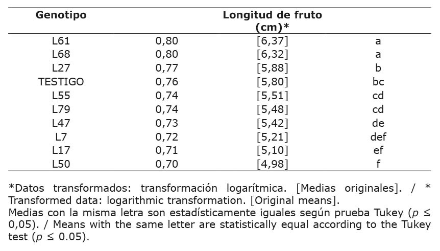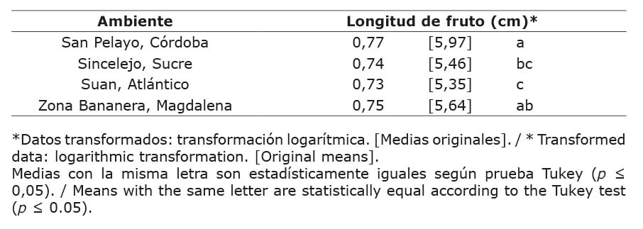 Para la variable longitud de fruto, se presenta el análisis de los factores genotipos y ambientes por separados, debido a que no hubo diferencias significativas en la interacción genotipo-ambiente. Los mejores ambientes fueron San Pelayo y Zona Bananera con promedios de 5,97 y 5,64 cm, respectivamente (Cuadro 6). Todos los cultivares evaluados, a excepción de la línea L50, superaron los 5 cm de longitud. Las líneas L61 y L68 fueron estadísticamente superiores en longitud de fruto, con promedios de 6,37 y 6,32 cm, respectivamente, superando a la línea testigo que presentó valores promedio de 5,80 cm (Cuadro 7).