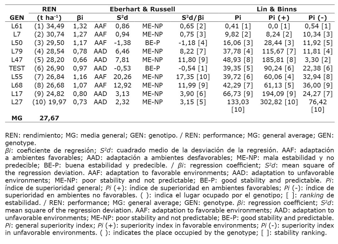Para la variable rendimiento, los análisis de estabilidad fenotípica utilizados fueron los métodos propuestos por Eberhart y Russell (1966) y Lin y Binns (1988). Para ello, se emplearon los programas estadísticos GENES versión 2013.5.1 (Cruz, 2013)