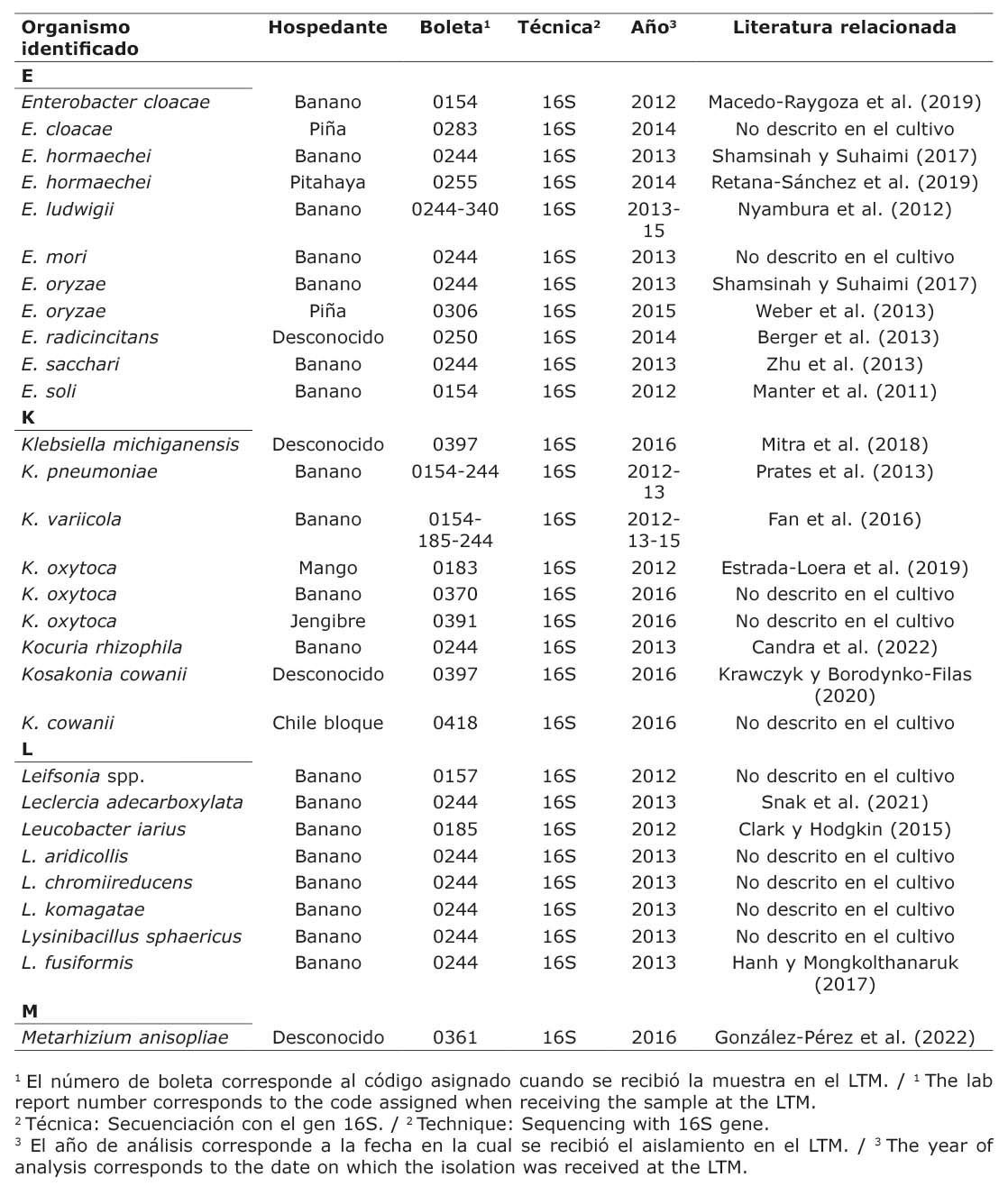 Table 4. Bacteria identified (letters E, K, L and M) at the Laboratory of Molecular Techniques applied to Plant Protection, Universidad de Costa Rica, Montes de Oca. San Jose, Costa Rica. 2009-2018.