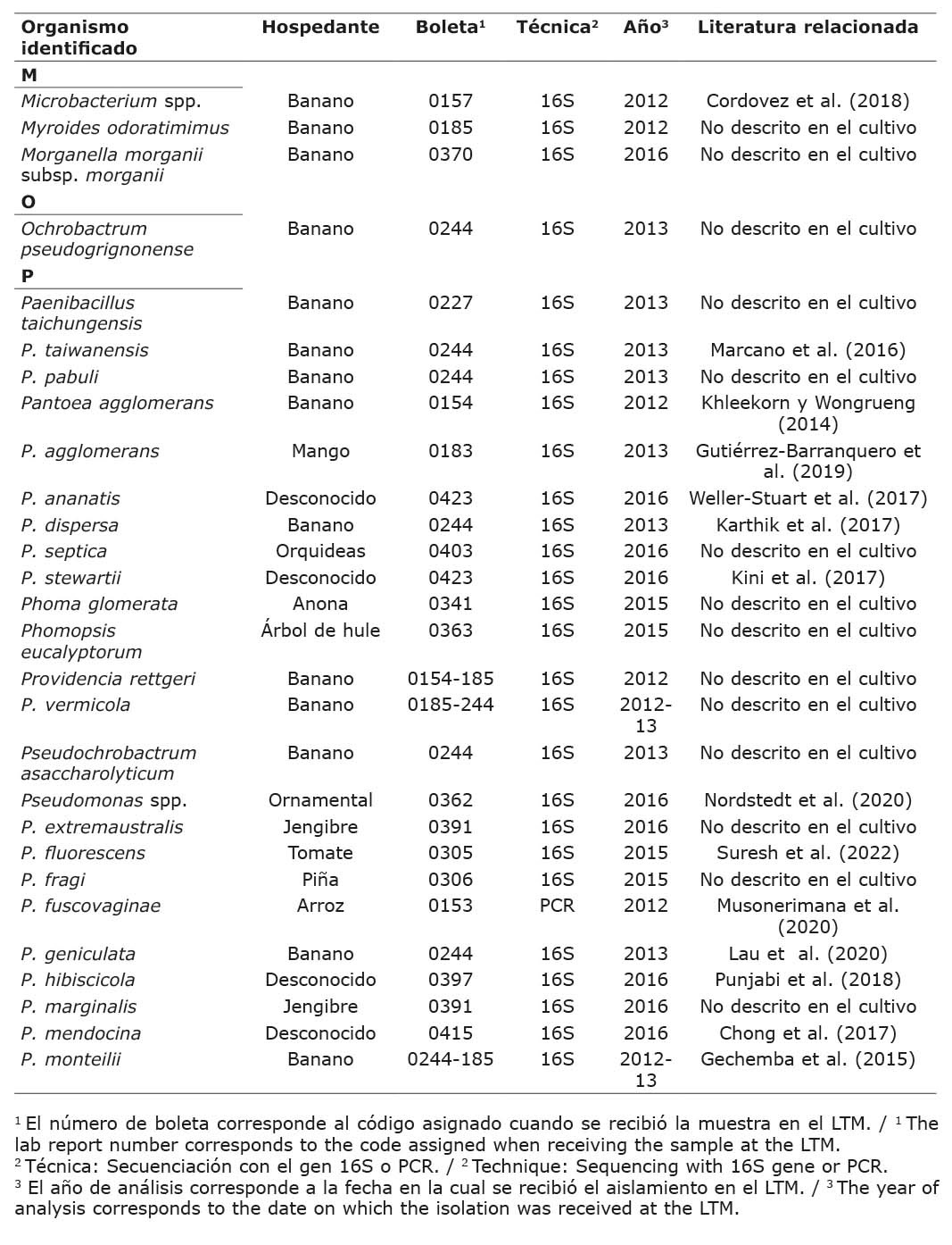 Table 5. Bacteria identified (letters M, O and P) at the Laboratory of Molecular Techniques applied to Plant Protection, Universidad de Costa Rica, Montes de Oca. San Jose, Costa Rica. 2009-2018.