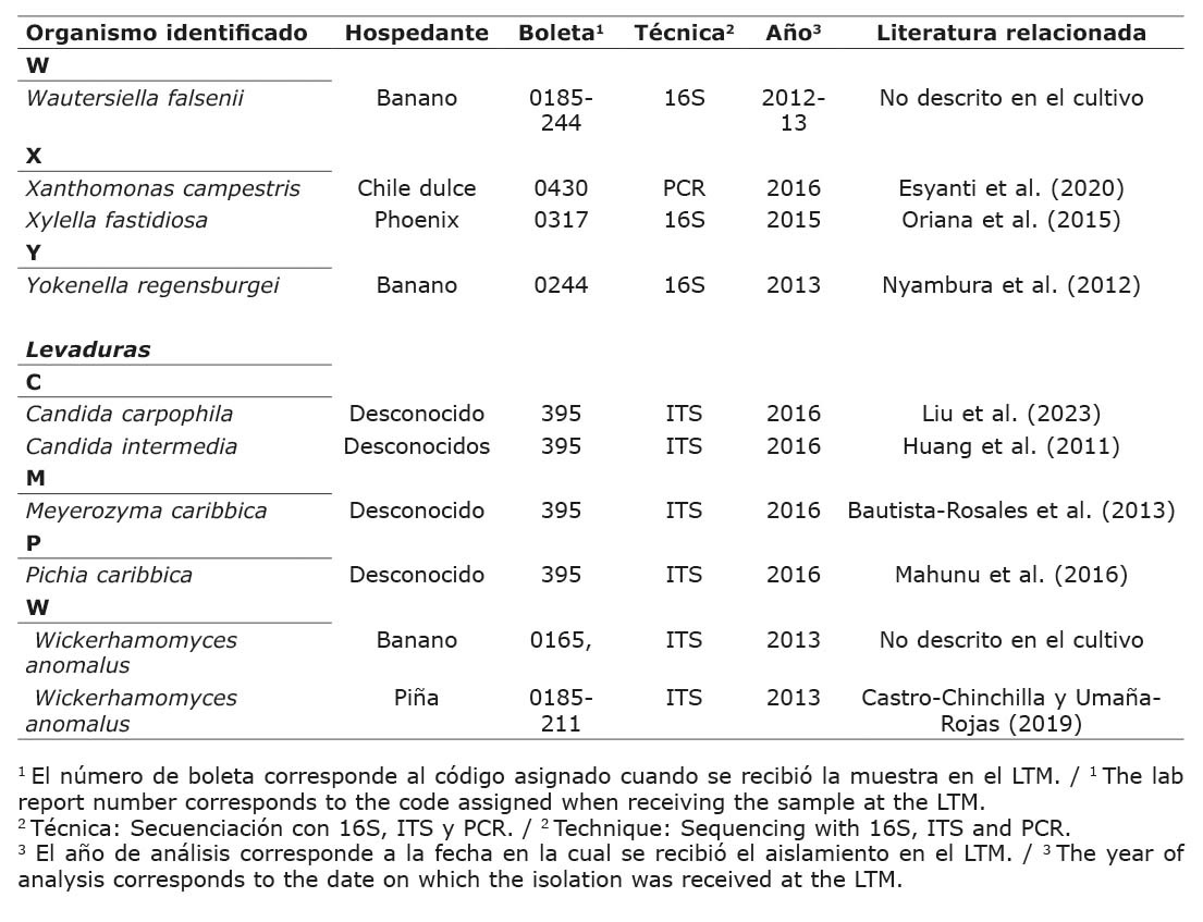Table 7. Bacteria (letters W, X y Y) and yeast (letters C, M, P and W) identified at the Laboratory of Molecular Techniques applied to Plant Protection, Universidad de Costa Rica. Montes de Oca, San Jose, Costa Rica. 2009-2018.