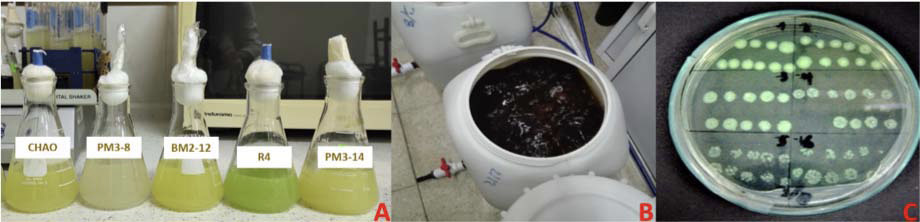 Figure 1. Process of cell multiplication of the rhizobacteria in liquid formulations. A) Growth of the bacterial pre-inoculum. B) Cell development in 50 L fermenters. C) Cell concentration 24 hours after microbiological analysis. Quevedo, Ecuador, 2020.