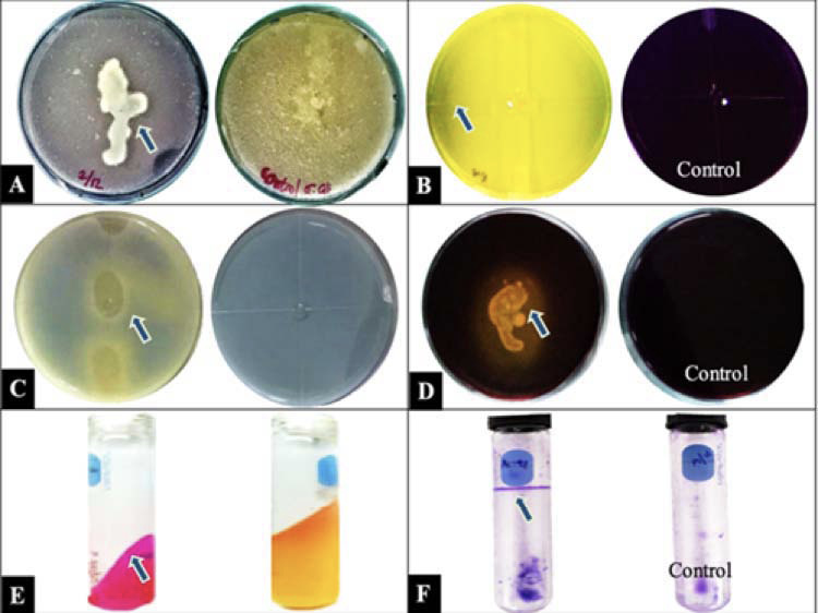 Figure 2. Enzymatic production of PGPRs for solubilization of each component. A. Chitinase. B. Organic acids for potassium solubilization. C. Phosphatases. D. Organic acids for zinc solubilization. E. Urease. F. Biofilm. Arrows indicate the site of compound release by PGPR. Ecuador, 2020.