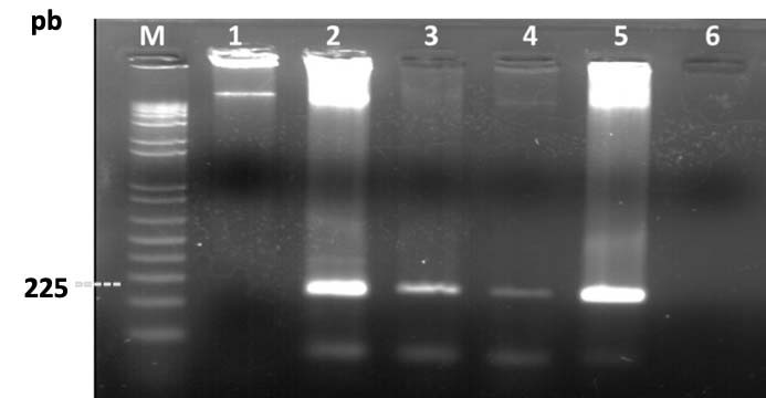 El ADNg bacteriano se obtuvo al emplear PureLink™ Genomic DNA Mini Kit - Thermo Fisher Scientific, según el protocolo descrito por el fabricante. Para la amplificación molecular, se emplearon los primers específicos chiAF (5’GATATCGACTGGGAGTTCCC3’) y chiAR (5’CATAGAAGTCGTAGGTCATC3’), con producto de amplificación 225 pb (Ramaiah et al., 2000). La reacción de PCR se realizó en 20 µL, con 5,0 μL Buffer (1X); 1,2 μL de MgCl2 (6 mM); 1,0 μL de DNTP`s (0,2 mM); 1 μL / cada primer (0,2 mM); 0,2 μL de Taq polimerasa (Promega®); 1 μL de ADN (50 ng/mL), y 11,6 μL de H2O. Se empleó un termociclador (TECHME®) y se ajustó su perfil térmico a 94 °C durante 4 min; 35 ciclos de desnaturalización a 92 °C; alineamiento a 58 °C, y polimerización a 72 °C por 1 min, seguidos de 7 min de extensión a 72 °C. Los productos de amplificación se verificaron por electroforesis en gel de agarosa al 1,5 % y teñidos en bromuro de etidio. Los fragmentos se determinaron por comparación con el marcador de peso molecular 100 pb (Invitrogen®).