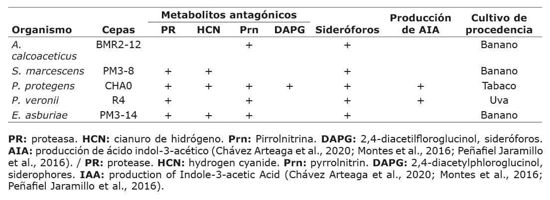 Table 1. Characteristics of rhizobacteria with antagonistic metabolite production, siderophores, indole-3-acetic acid production and crop of origin. Ecuador, 2020.