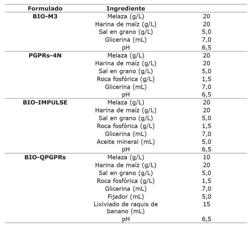 Table 2. Composition of the different formulation under study for the growth and viability of rhizobacteria. Ecuador, 2020.