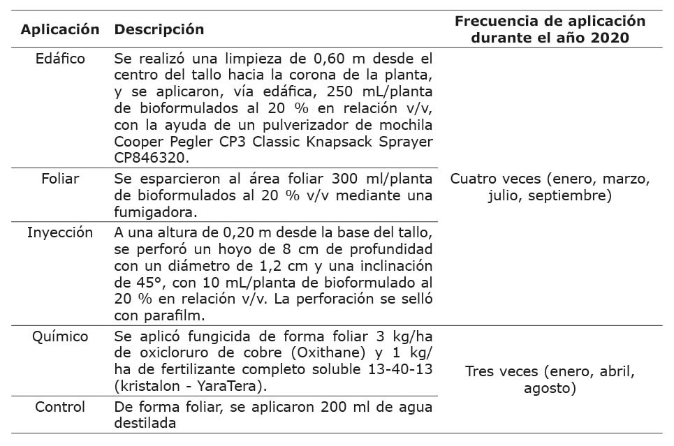 Como labores culturales se realizaron dos podas (formación y mantenimiento) durante el año, en los meses de enero y junio. Además, se realizó un control de maleza cuatro veces al año, con aplicaciones de paraquat (2,0 L/ha) y desmalezadora a motor. La fertilización química se realizó en tres aplicaciones fraccionadas de urea (N46 %) 150 g/planta; DAP (N 18 %, P 46 %) 70 g/planta; KCl (K 60 %) 150 g/planta y sulfato de Mg (Mg 27% y S 20%) 29 g/planta. La aplicación del fertilizante se realizó al voleo, mediante aplicación directa al suelo, desde la base de la planta a un metro a la redonda lo que cubrió la corona de forma homogénea (Ruales et al., 2011).