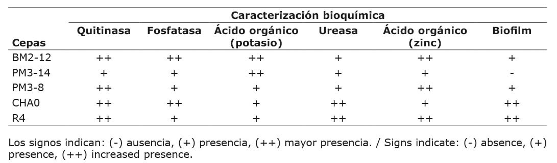 Las cepas bacterianas (Cuadro 1) se reactivaron de forma individual en medio de cultivo King B líquido (KBL) a 28 °C a 180 rpm por 24 h, y se usaron para determinar la capacidad hidrolítica de urea a dióxido de carbono por el método de Christensen (1946), la actividad fosfatasa (Pikovskaya, 1948) y la producción de ácidos orgánicos para solubilización de potasio (Hu et al., 2006) y de zinc (Saravanan et al., 2004). La generación de biofilm se determinó de forma cualitativa por el método de cristal violeta (Alexander & Zuberer, 1991) y producción de quitinasa (Moon et al., 2017). En cada prueba se empleó como control negativo agua desionizada estéril.
