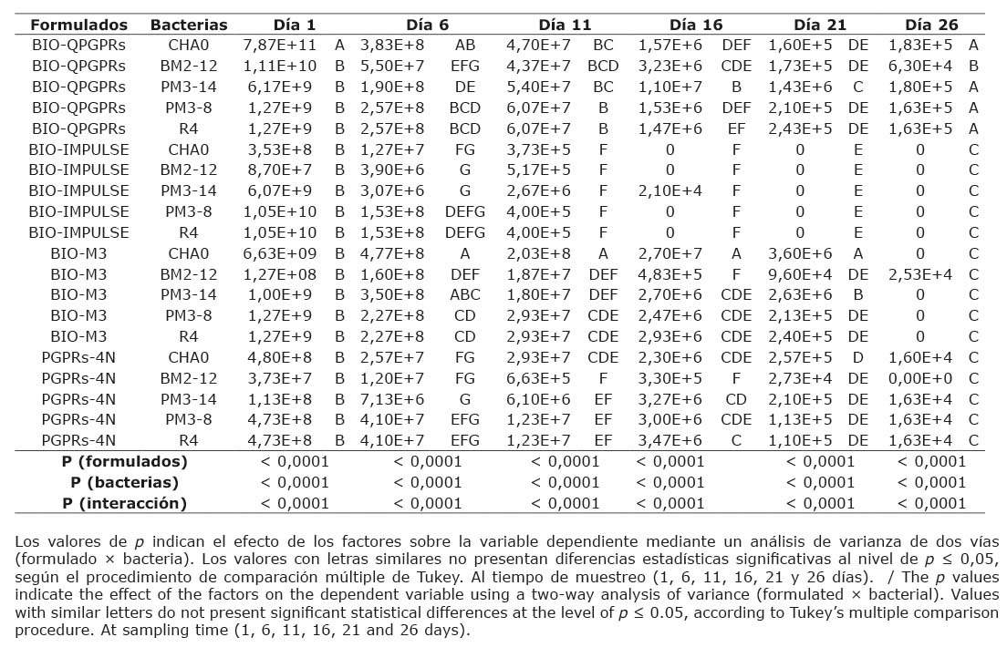 Para el día 16, los bioformulados BIO-M3 y BIO-QPGRs mantuvieron la concentración celular en CHA0 y PM3-14 en 2,70E+7 y 1,10E+7 UFC/ml. La disponibilidad de células vivas para las rizobacterias CHAO, M2-12, PM3-8 y R4 tuvo un efecto negativo en BIO-IMPULSE que decreció en su totalidad la presencia de células vivas (Cuadro 5).